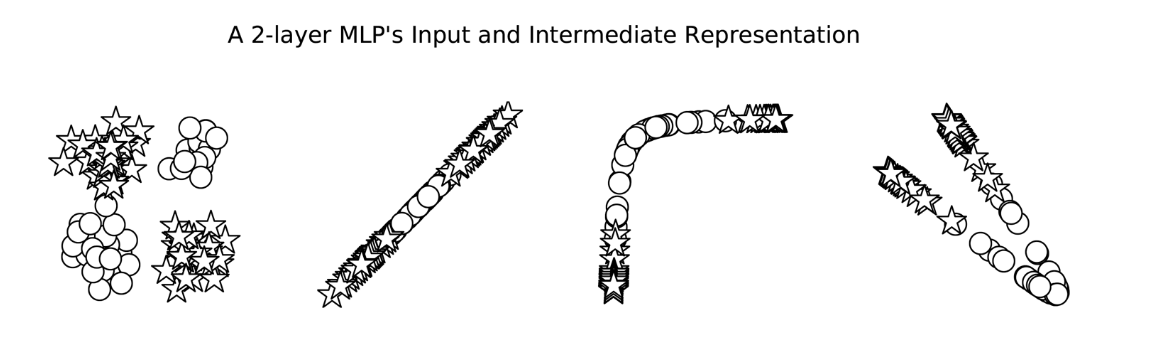 mlp的力量来自于添加第二个线性层和允许模型学习一个线性分割的的中间表示——该属性的能表示一个直线(或更一般的,一个超平面)可以用来区分数据点落在线(或超平面)的哪一边的。学习具有特定属性的中间表示,如分类任务是线性可分的,这是使用神经网络的最深刻后果之一,也是其建模能力的精髓。在下一节中,我们将更深入地研究这意味着什么。