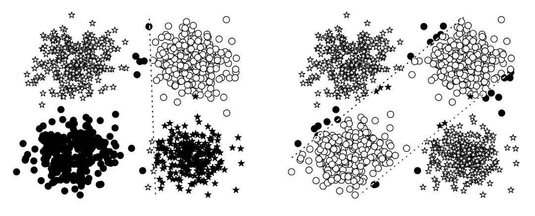 让我们看一下前面描述的XOR示例,看看感知器与MLP之间会发生什么。在这个例子中,我们在一个二元分类任务中训练感知器和MLP:星和圆。每个数据点是一个二维坐标。在不深入研究实现细节的情况下,最终的模型预测如图4-3所示。在这个图中,错误分类的数据点用黑色填充,而正确分类的数据点没有填充。在左边的面板中,从填充的形状可以看出,感知器在学习一个可以将星星和圆分开的决策边界方面有困难。然而,MLP(右面板)学习了一个更精确地对恒星和圆进行分类的决策边界。