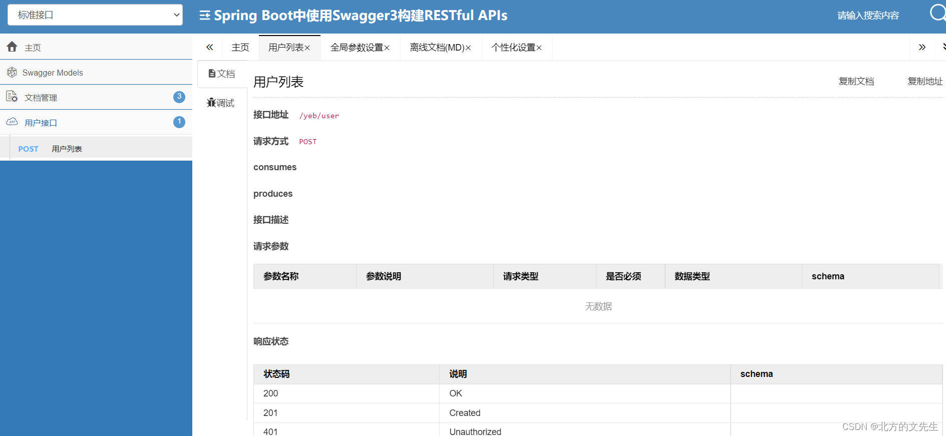 * 使用了第三方UI的访问路径为 http://localhost:8080/doc.html/