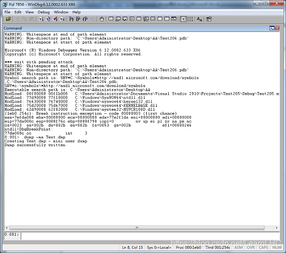 执行命令:.dump –ma Test.dmp ,则会产生一个Test.dmp的转储文件。