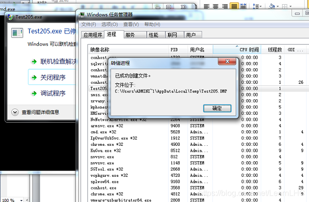 在程序崩溃后,先不关闭程序,在任务管理器中找到该程序对应的进程。右键—>创建转储文件