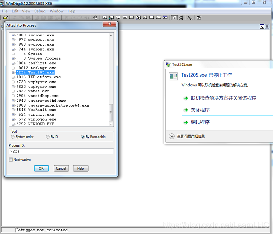 程序运行崩溃后,先不关闭程序,将WinDbg附加到改进程上