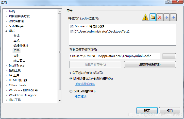 c) 当把 pdb 文件与 dmp 文件放入同一目录下时,就不需设置其路径,否则需要设置 符号表 文件路径 和 源代码路径