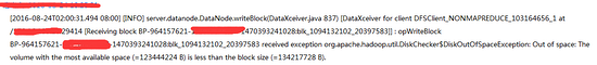 在上面的提到dfs.datanode.du.reserved的值是设成100G,因为namenode认为该节点还有剩余的空间,所以给分配到这里,假如这个块是128K,但是实际剩余空间只有100K,所以就会报上面的错误,假如把dfs.datanode.du.reserved成300G,让namenode知道该节点已经没有剩余空间,所以就不会往这里写数据了。