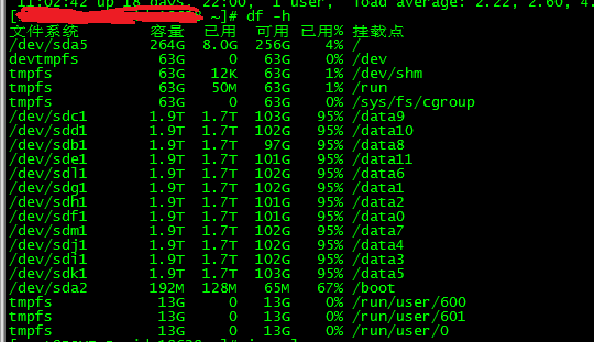 登陆到该机器上查看服务器的磁盘,磁盘都快已经达到100%,如下: