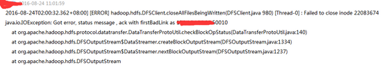 这种错误无法通过namenode来避免,因为它不会再failed的时候去尝试往别的节点写数, 最初的办法是将该节点的datanode关闭掉,就能顺利地跑完这个mapreduce。