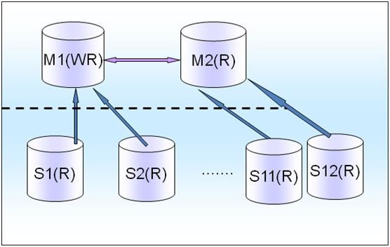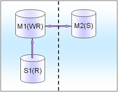 M(R)仅仅是一个备库,只有M(WR)挂了之后,才会切换到M(R)上,这个时候M(R)就变成了读写库。比如游戏系统,有很多Salve会挂载后面一个M(R)上面。