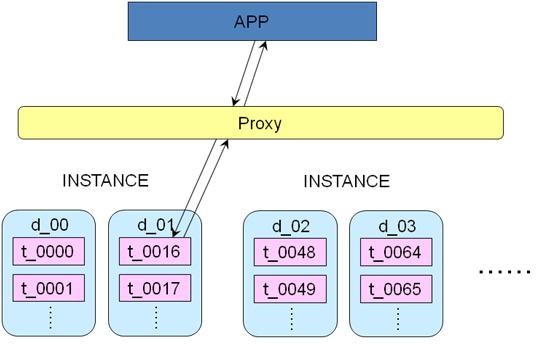 – 拆分之后的查询操作,做一个Proxy,APP访问Proxy,Proxy根据访问规则就可以直接路由到具体的db实例,生成新的sql去操作对应的db实例,然后通过Proxy协议进行操作把操作结果返回给APP。