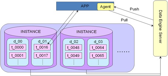 – 拆分之后的查询操作,有一个Data Engine Service,这个DES里面配置了所有数据库实例的映射关系,需要在APP应用端安装一个Agent,是同步逻辑,在JDBC层实现,DES可以实现读写分离,原理可以参考TDDL的实现。