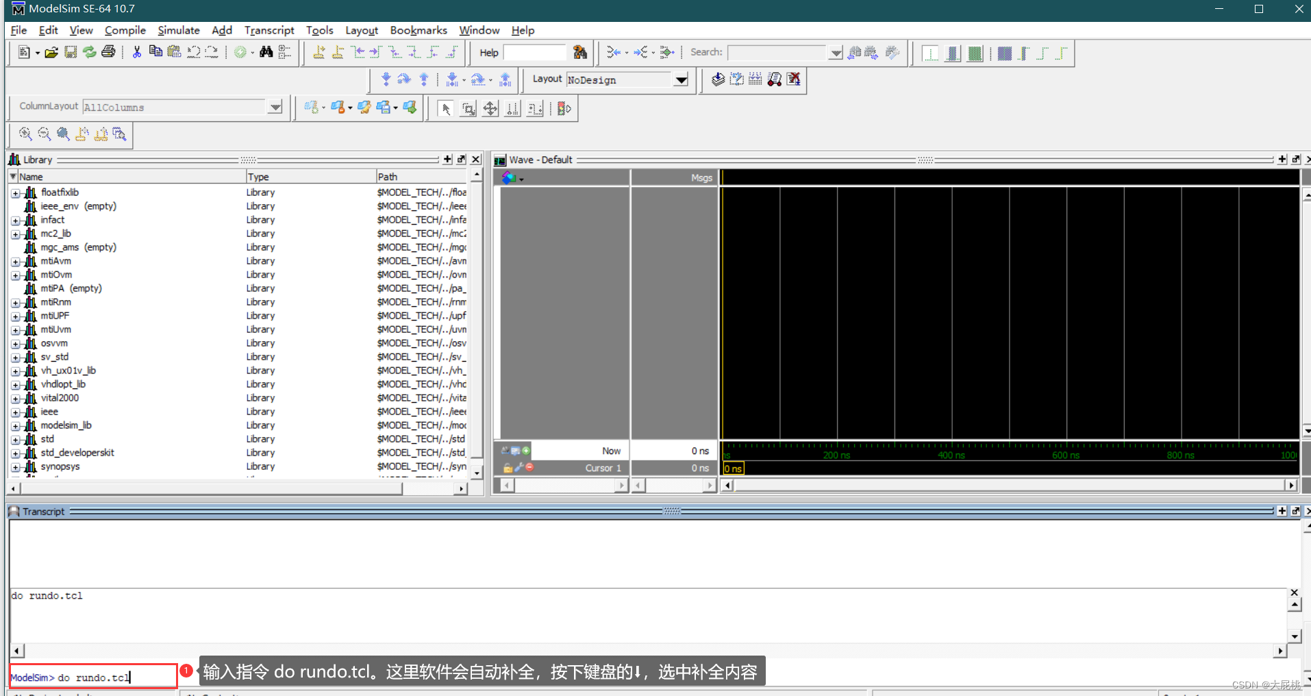 第五步、在modelsim的命令行:输入指令do rundo.tcl。这里软件会自动补全,按下键盘的⬇,选中补全内容。