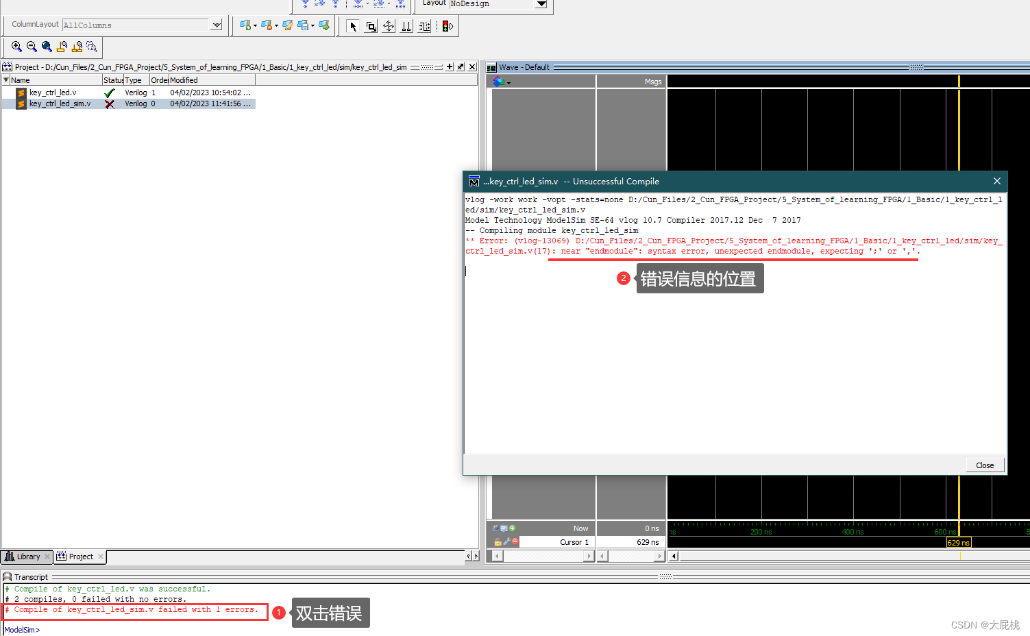 第一步、编译文件后报错,一般是添加的.v文件代码错误,双击错误,看一下出错的地方。