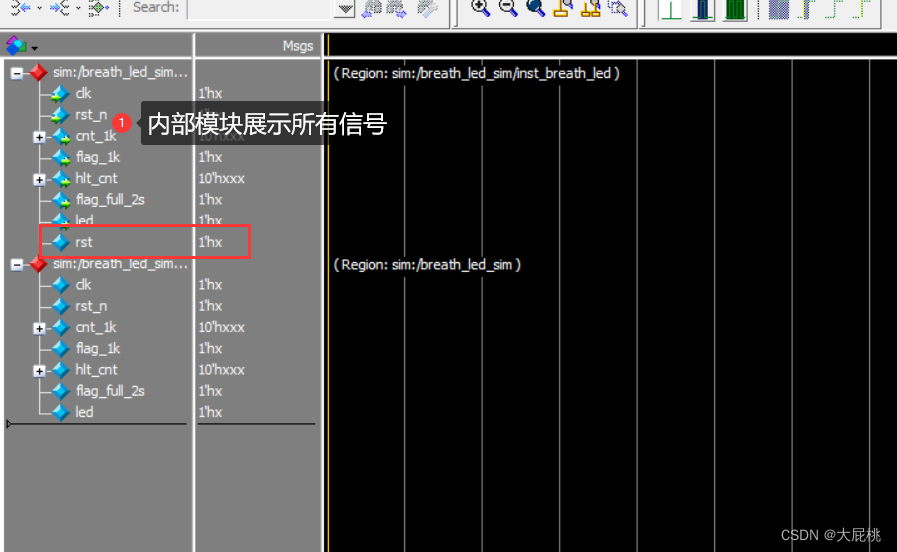 add wave /"modelsim工程名称"/"顶层例化名称"/*