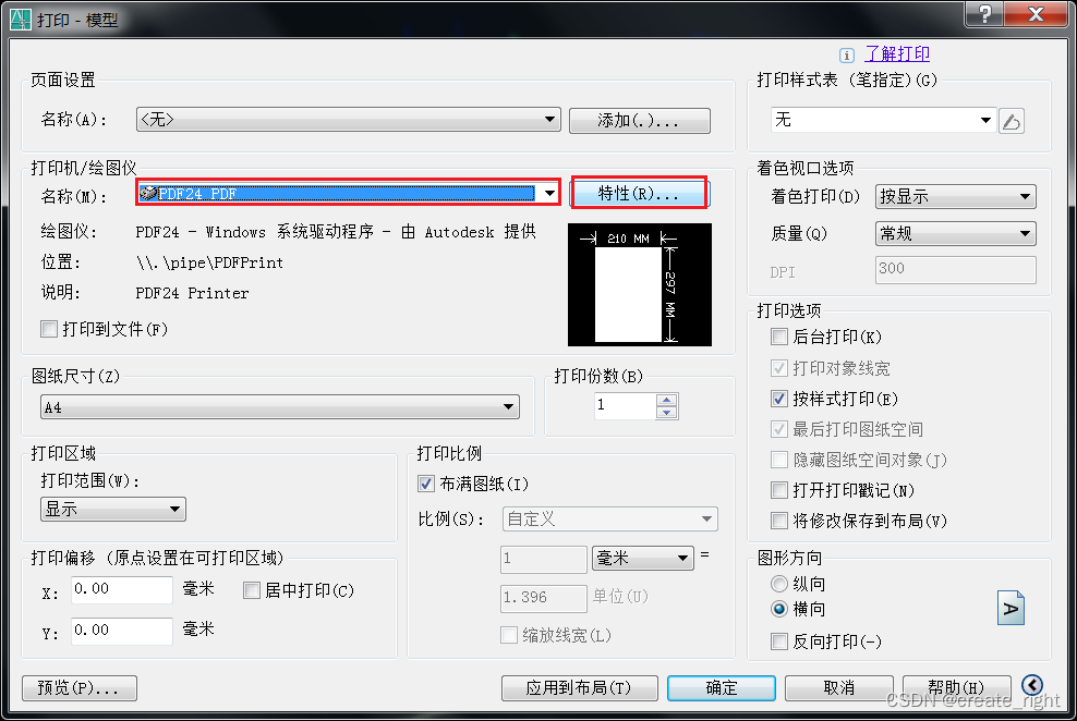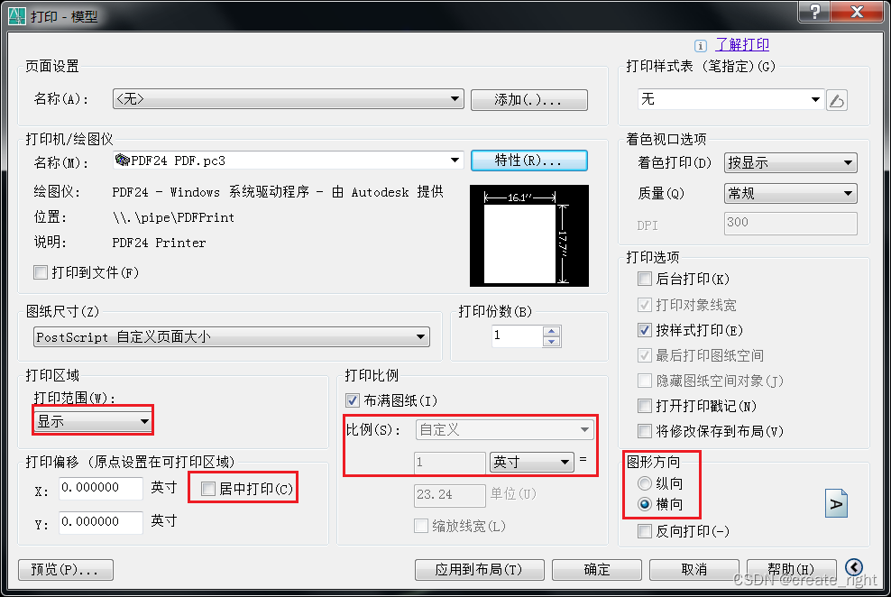 注意:需要根据图形的形状来确定图纸的方向以及打印设置中图形的方向。