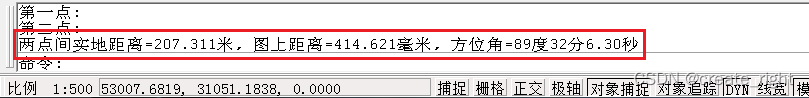 读取实地距离,用于设置纸张大小。说明:如果要打印的比例尺是1:500的,则实地距离除以0.5,得到图纸尺寸;如果是1:2000的比例尺,则除以2,得到需打印图纸的大小;如果是1:3000的,则除以3。以此类推,求得对应比例尺的打印尺寸。