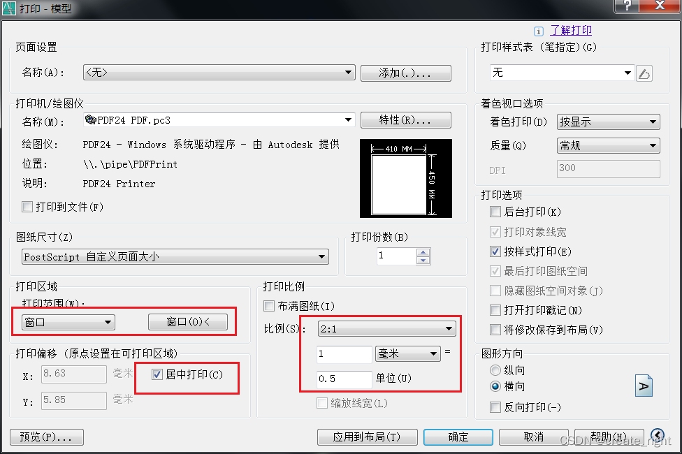 1:500比例尺选择比例为:(1:2),打印范围选择窗口,随后在视图区框出地形图的范围为打印范围。打印偏移选择居中打印。设置好如上参数后,选择预览,查看打印情况。