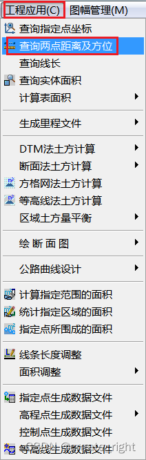 2、在“工程应用”菜单栏中,选择“查询两点距离及方位”,如下:
