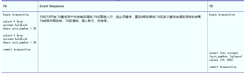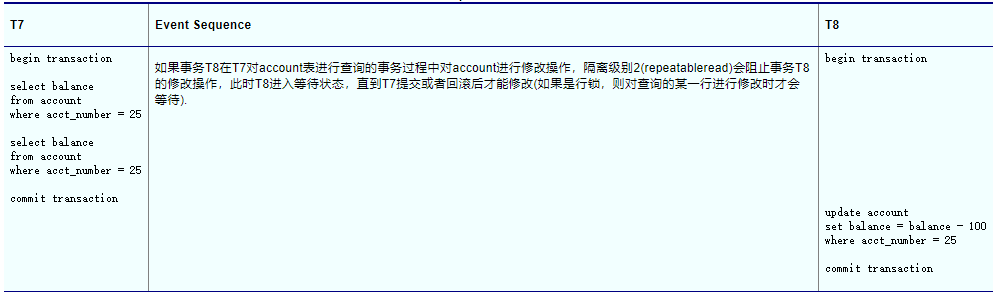 该级别没有办法解决“幻读”的问题,因为该级别只保护了一个事务期间读取的数据不被update和delete,但是仍然可以使用insert,如果其他数据被insert后恰好满足了当前事务的过滤条件(where语句),那么就会发生“幻读”的情况。例如事务T7对一个表中的所有数据项都做了如果是“1”则修改为“2”的操作,此时事务T8向表中插入了一行数据项为“1”的数据,然后T1在修改后再次查询会发现还有一行没有修改,就好像产生幻觉一样,这就是发生了幻读。