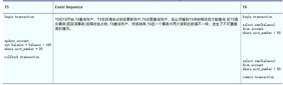 如果T5持有一个表独占写锁(会阻塞其他用户对同一表的读和写操作),T6就会等待,直到独占锁被释放,如果T5使用的是页锁或行锁,则T6可以开始执行,但是当T6试图获取T5锁定的页或行的共享锁时会被阻塞,这样做使得T6只能在提交或者回滚后获得数据,避免了脏读,但是如果多次提交,会产生不可重复读现象,即每次读取到的数据不一样。