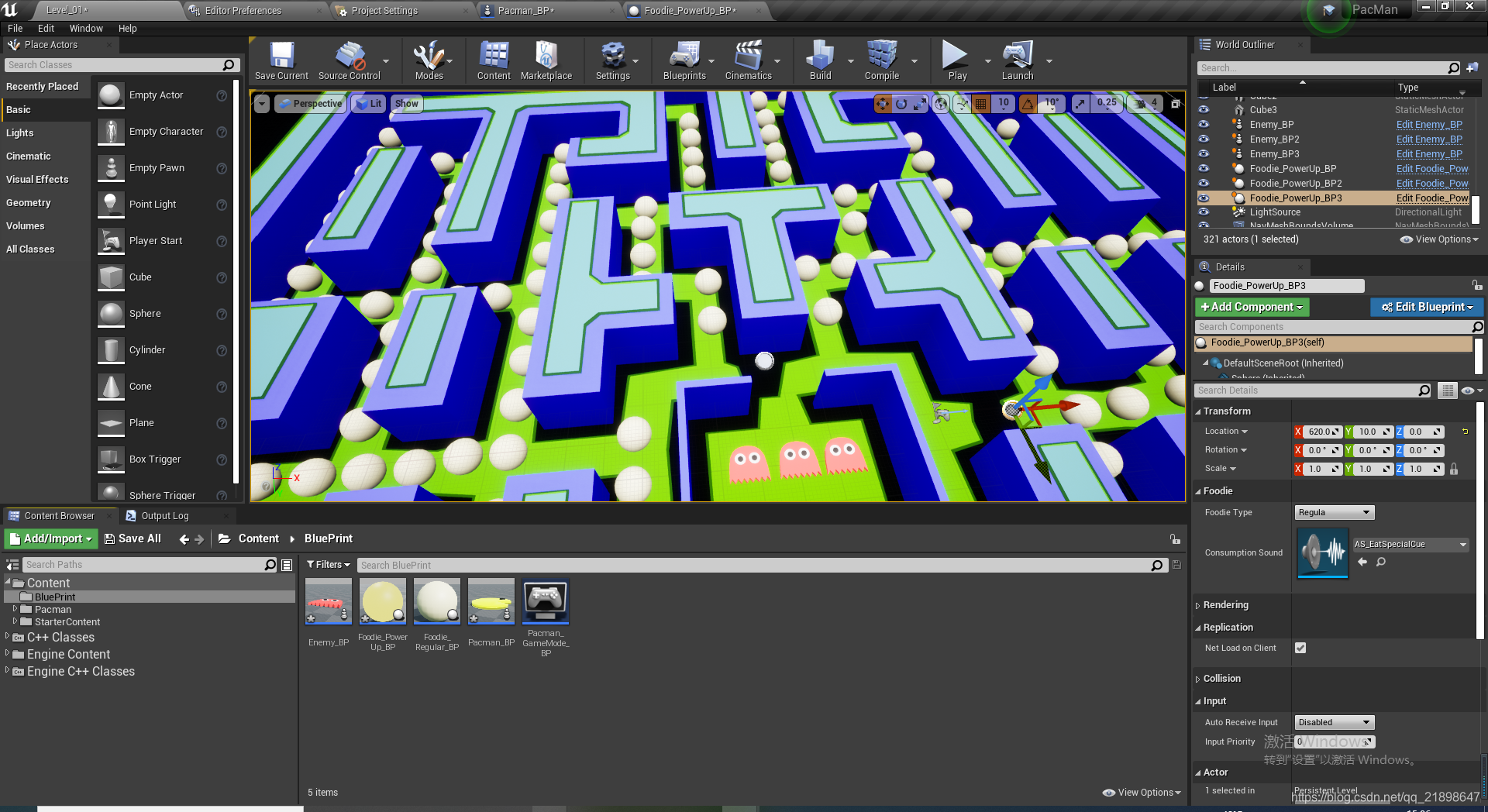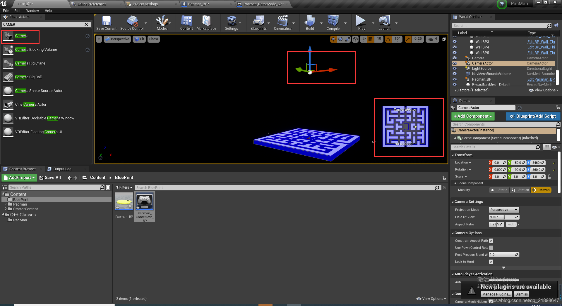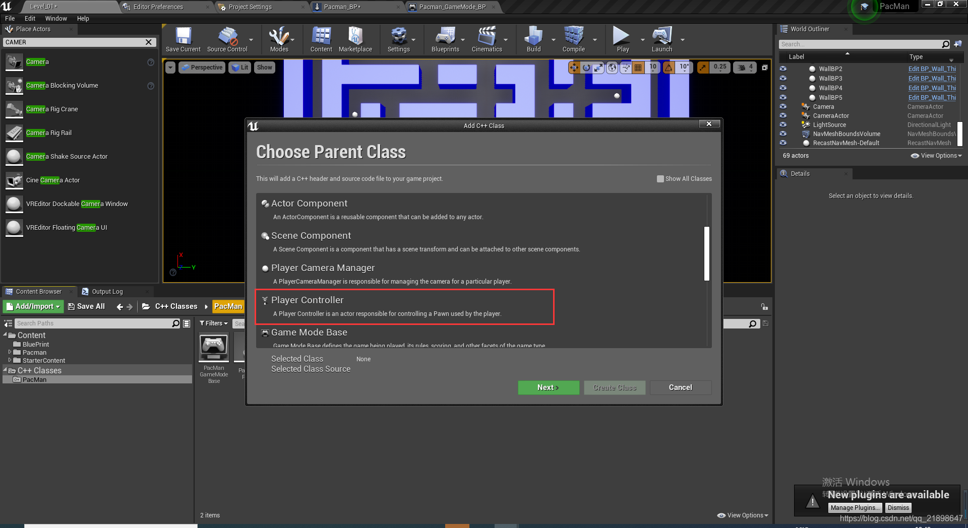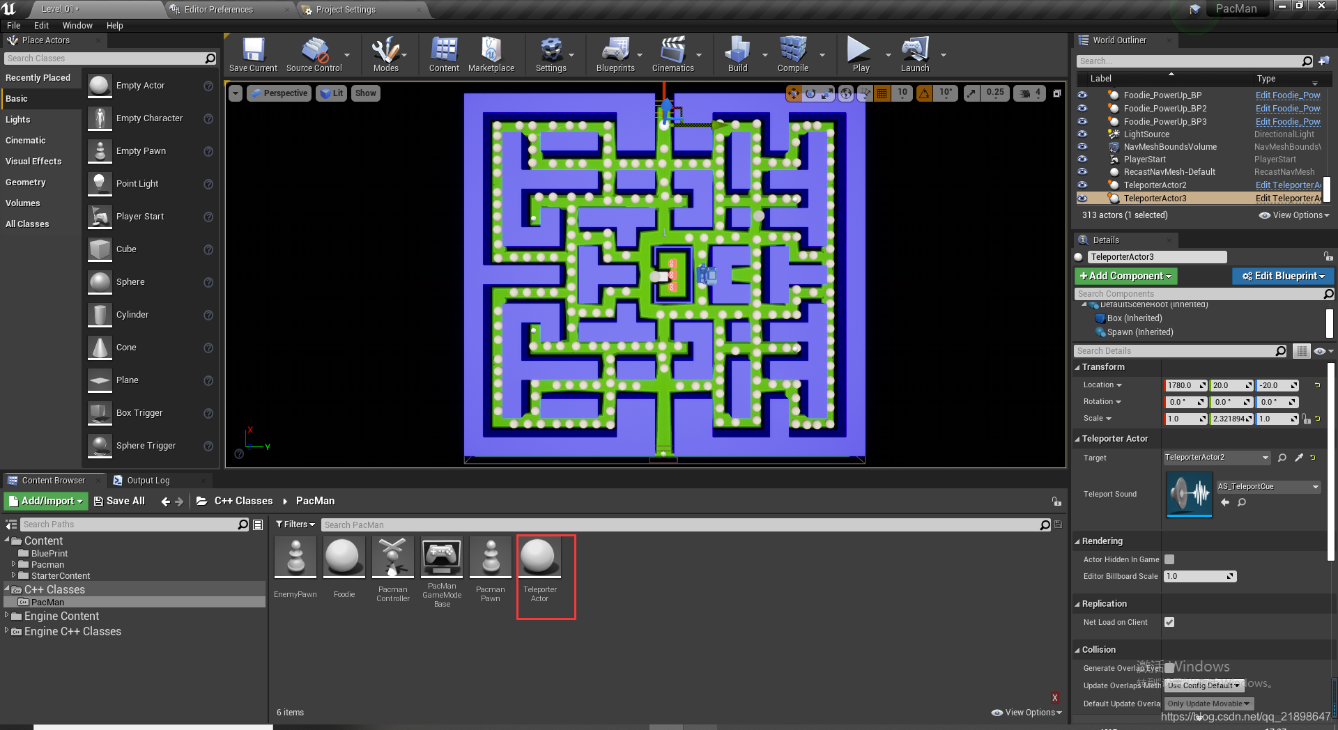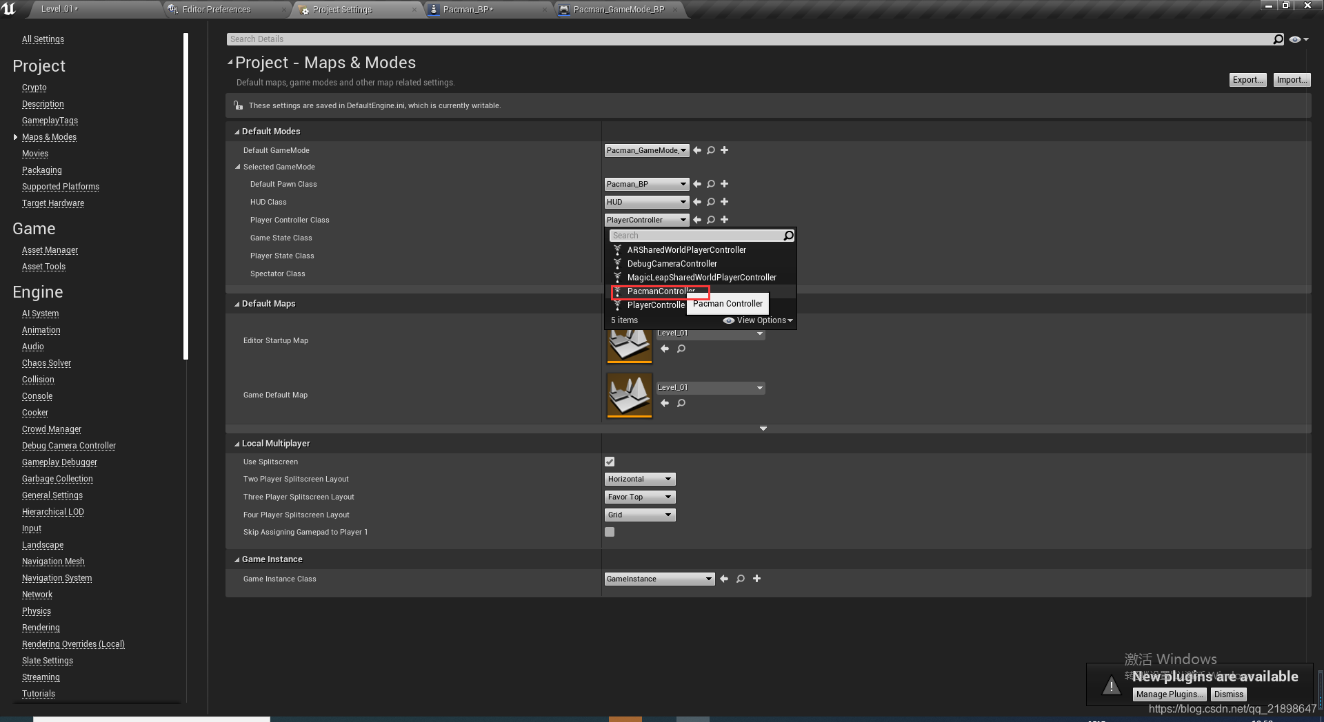 Player Controller Class设置为PacmanController,这样在C++类中就能获取到场景中Actor