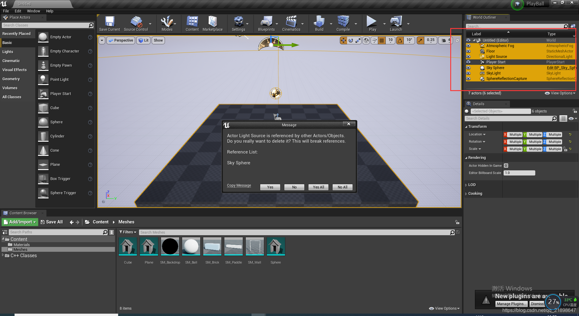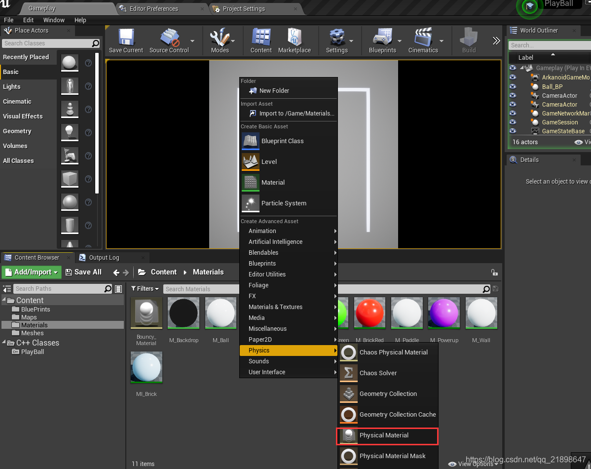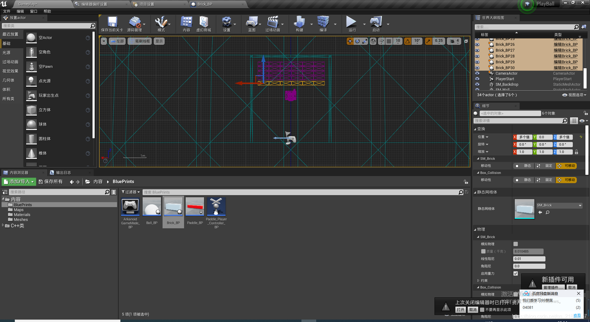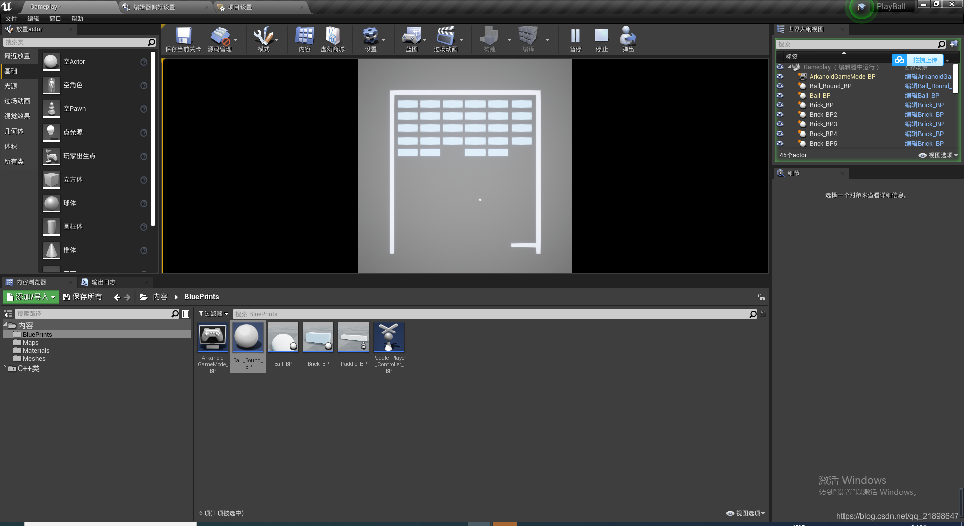 这篇博客详细介绍了如何使用Unreal Engine构建一款类似Arkanoid的游戏。首先,创建项目并导入必要的素材,然后构建关卡,添加背景和墙壁。接着,创建Paddle的C++类并实现移动功能,通过蓝图设置Paddle的外观和行为。此外,还创建了PlayerController,用于处理玩家输入和移动控制。进一步,添加了球体的物理属性和发射机制。最后,创建了砖块和边界,实现了碰撞检测和砖块破坏效果。游戏还包括了小球下落时的处理逻辑。