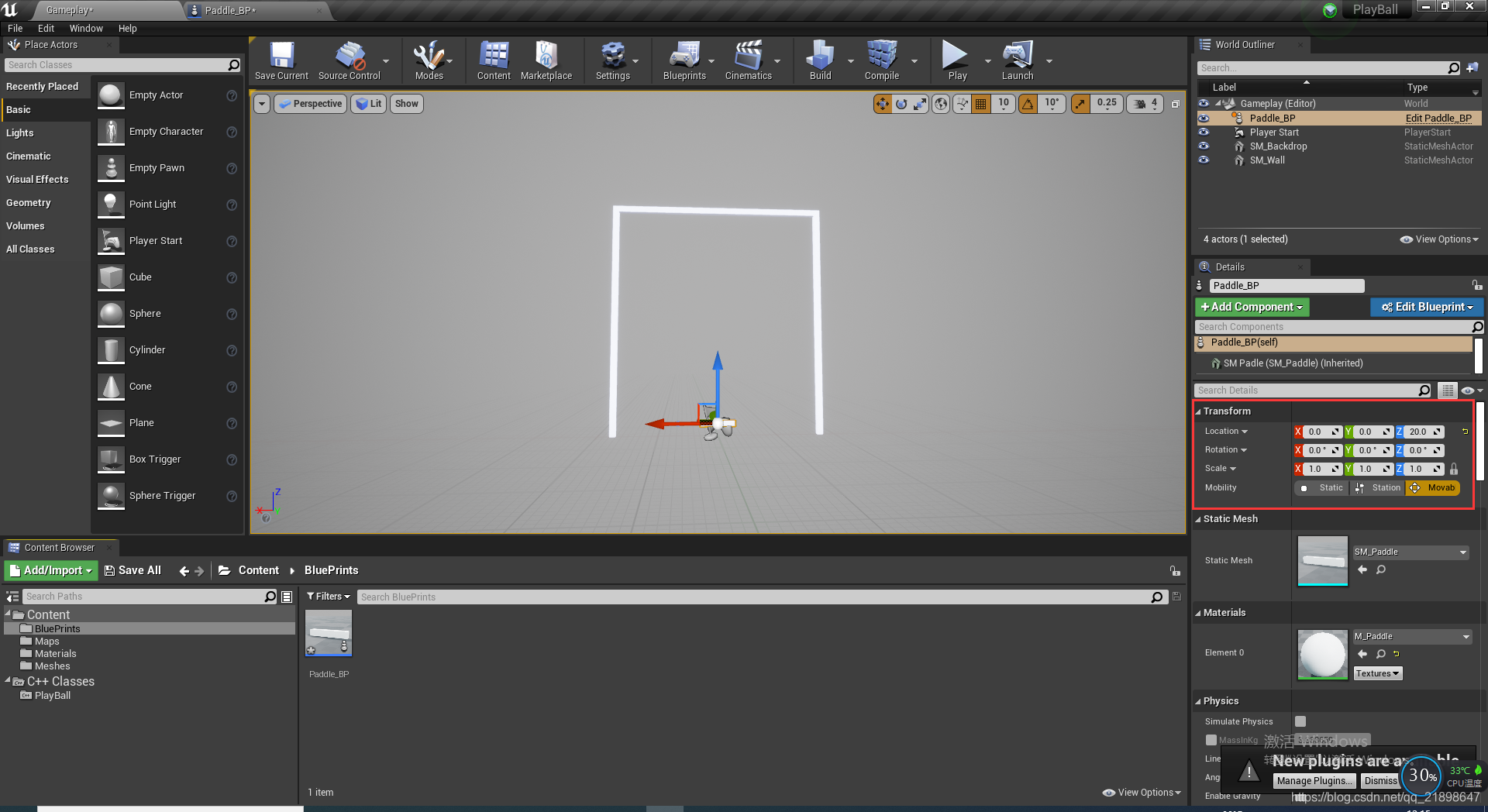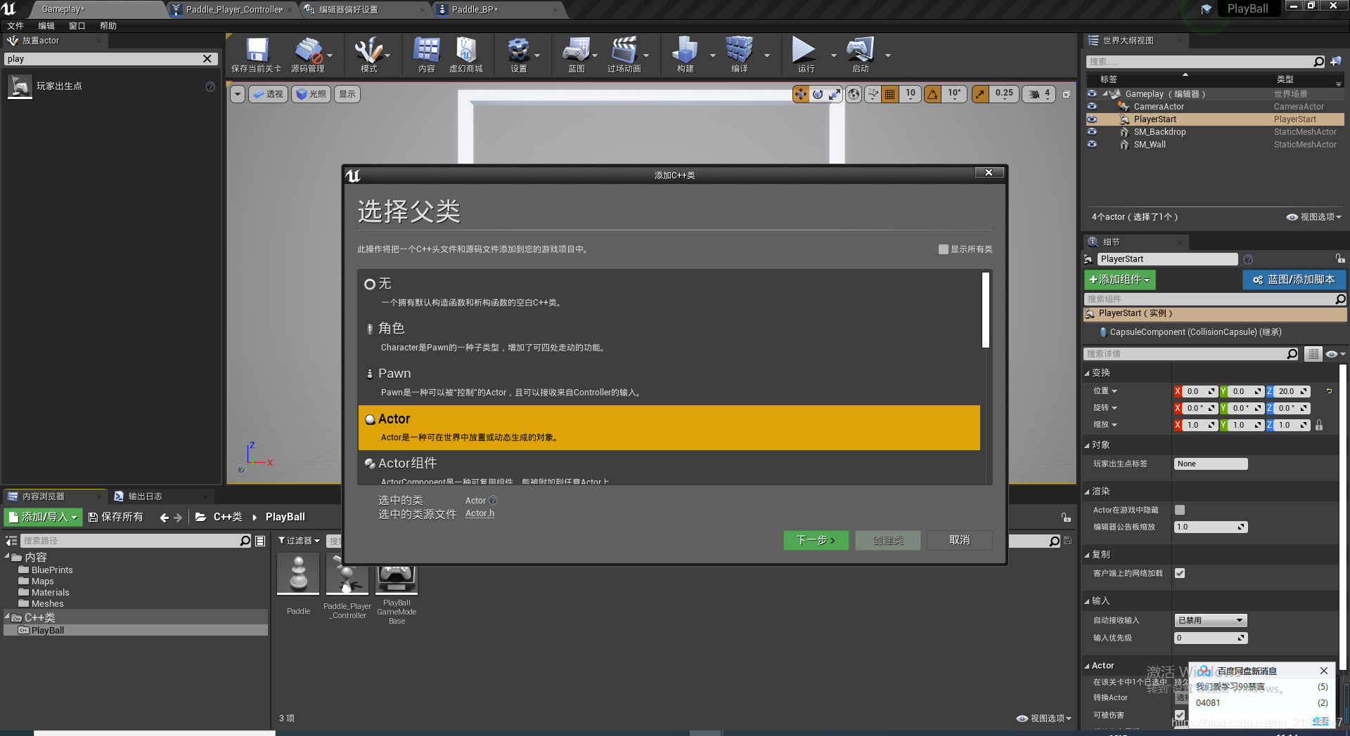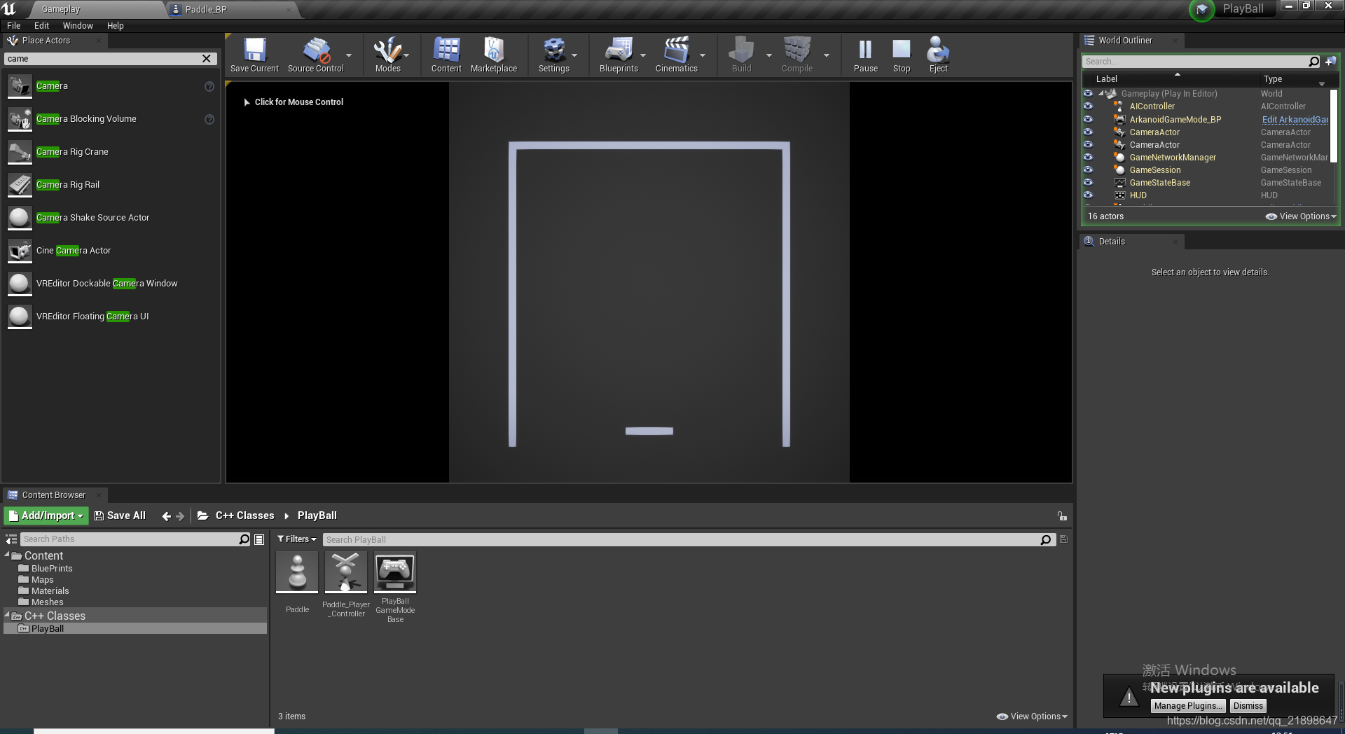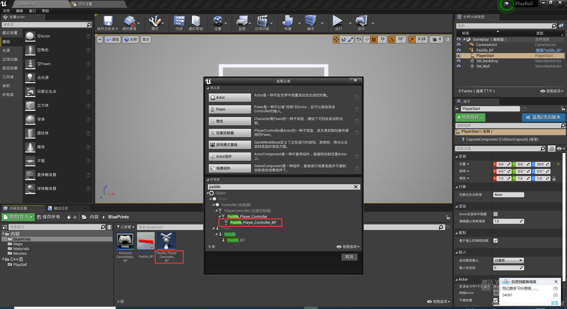 这里需要注意的是,在关卡中只需要放PlayerStart即可,不需要放Paddle_BP,否则会不能移动。