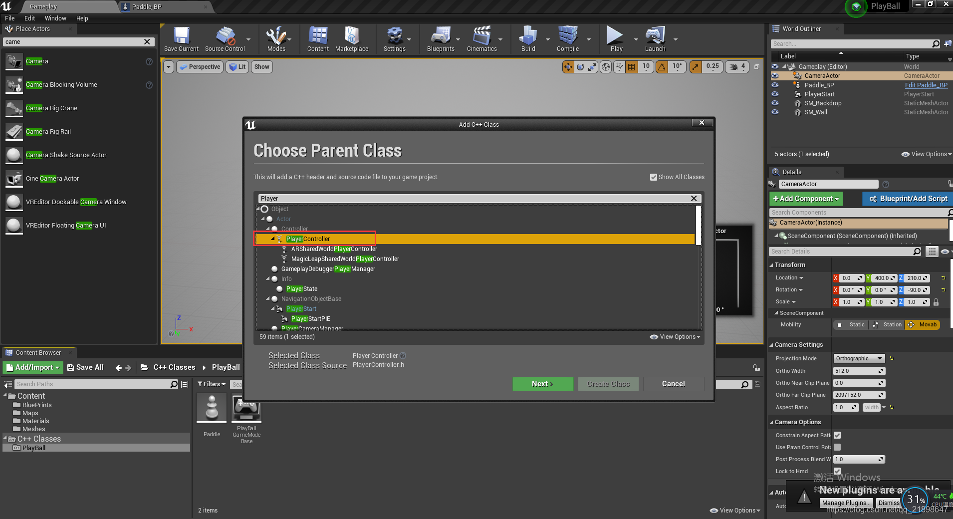 Paddle_Player_Controller.cpp中设置相机为主视角
