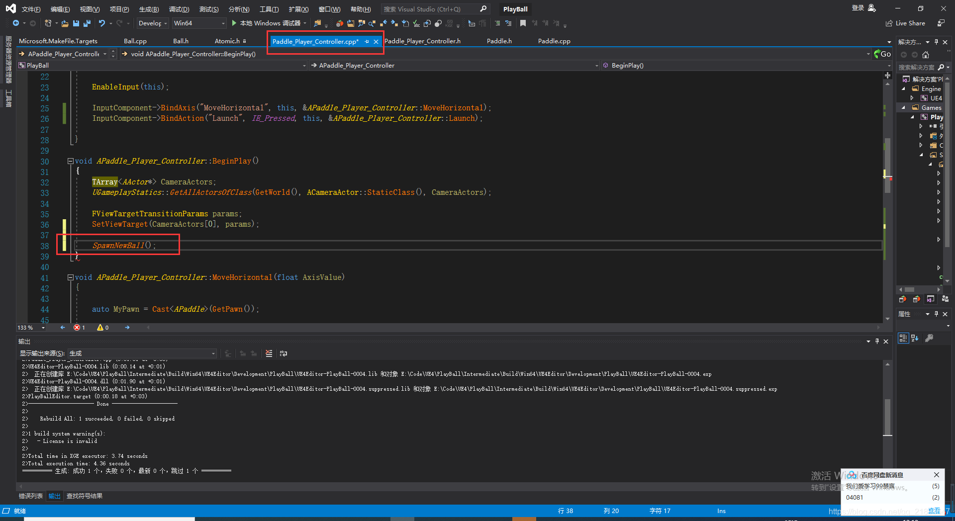 在Paddle_Player_Controller.h实现SpawnNewBall()函数