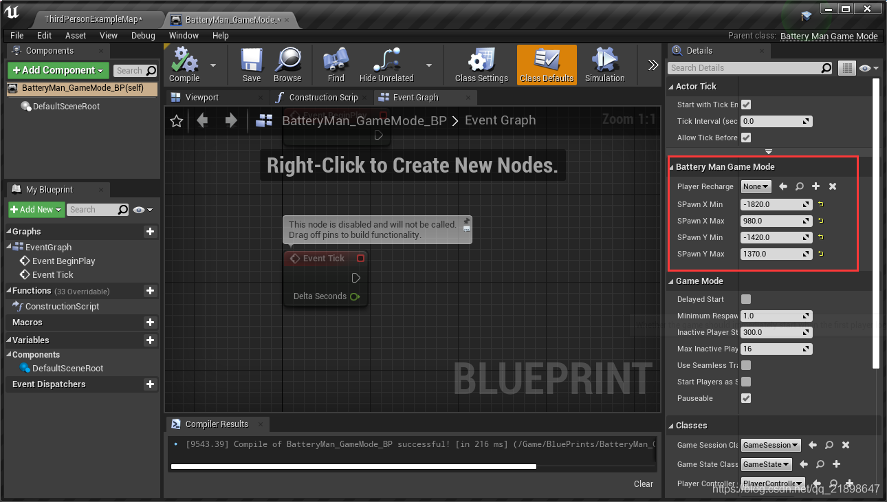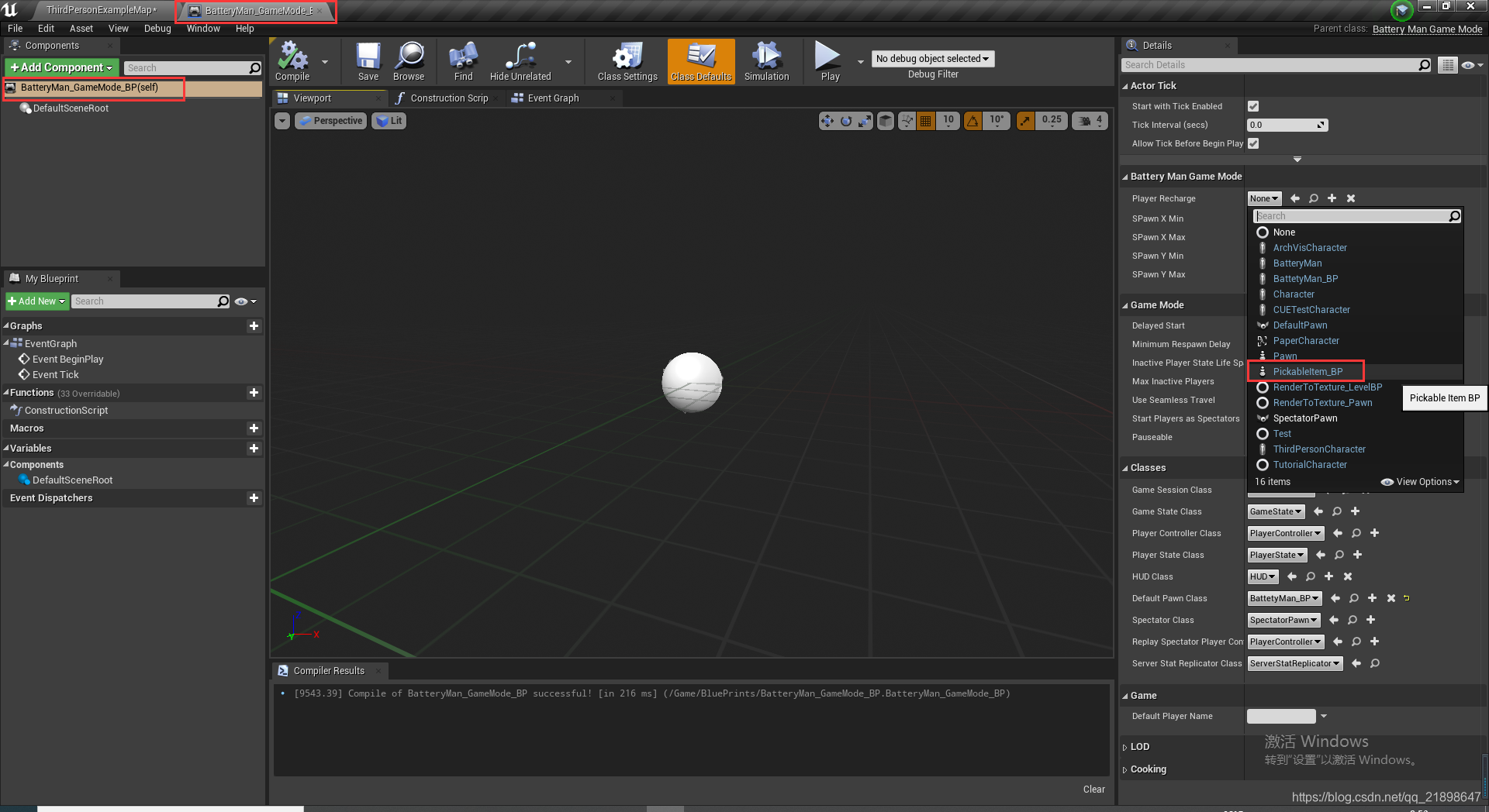 新建该类的蓝图,这里蓝图类的名称为BatteryMan_GameMode_BP: