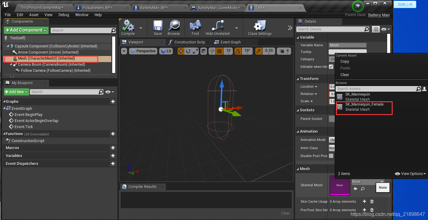 双击打开刚刚新建的蓝图类,选择Mesh的Skeleten