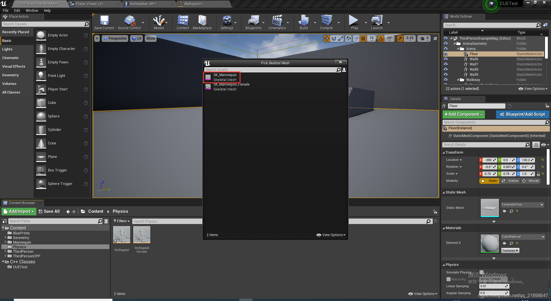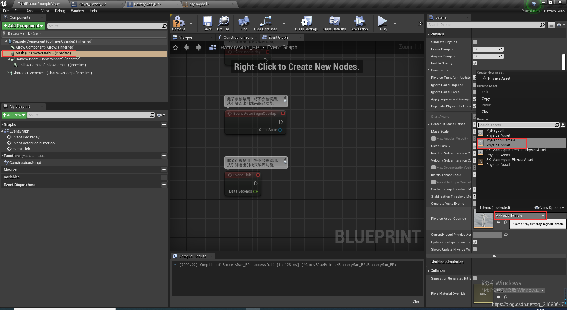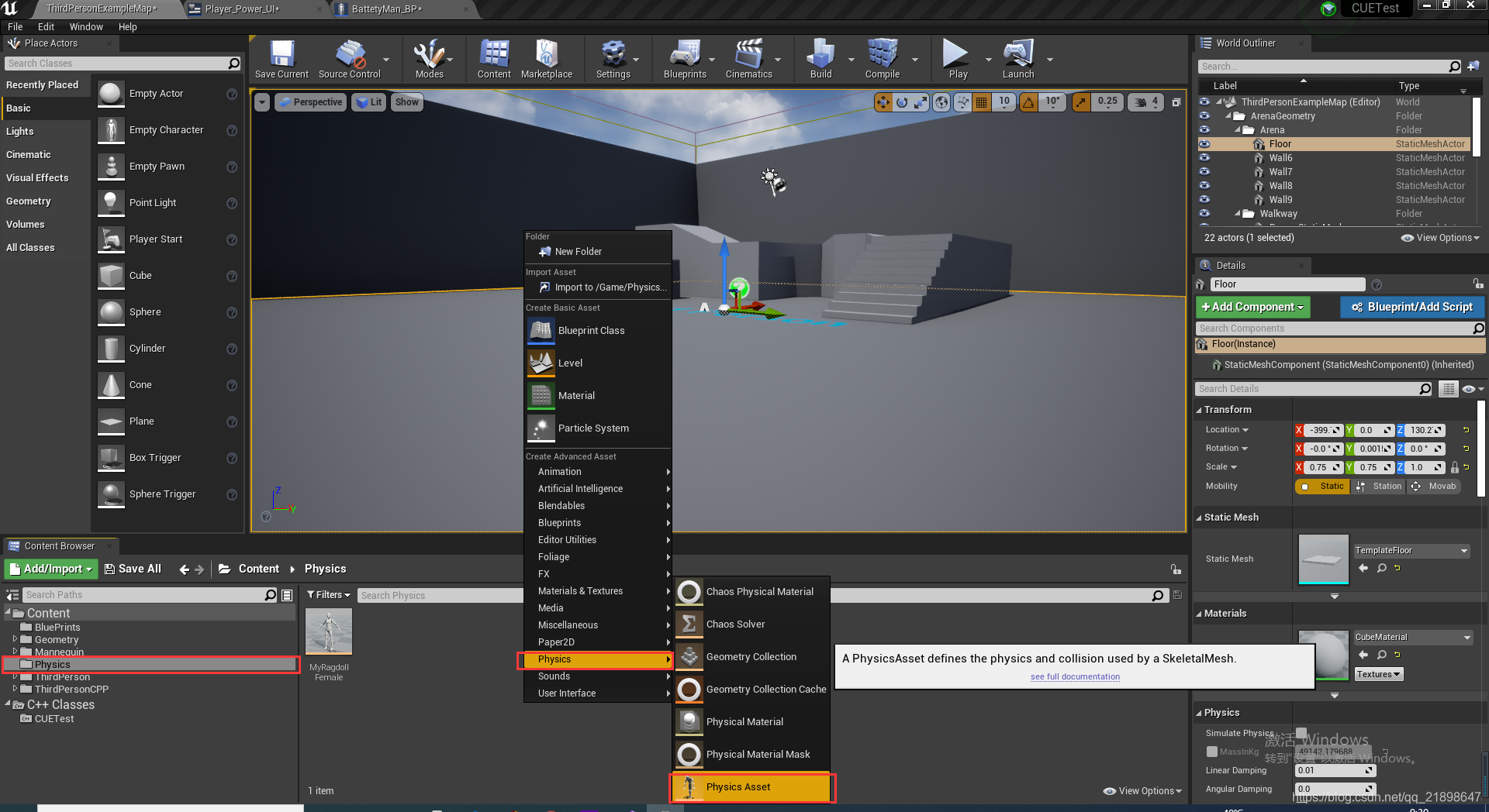 首先新建Physics文件夹,并在该文件夹内新建Physics Asset蓝图类,并命名为MyRagDollFemale