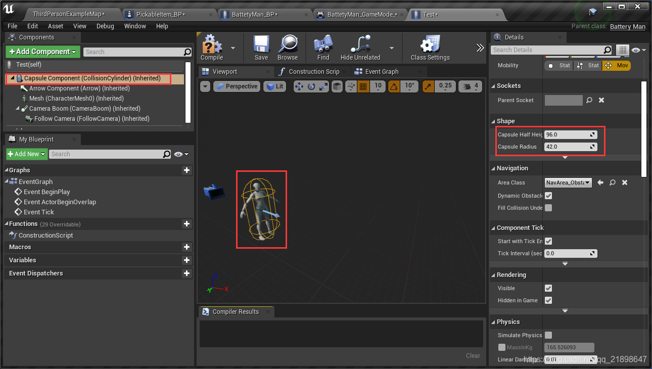 为了让这个蓝图类更具有通用性,我们在BatteryMan的构造函数BatteryMan::ABatteryMan()中设置胶囊体的大小: