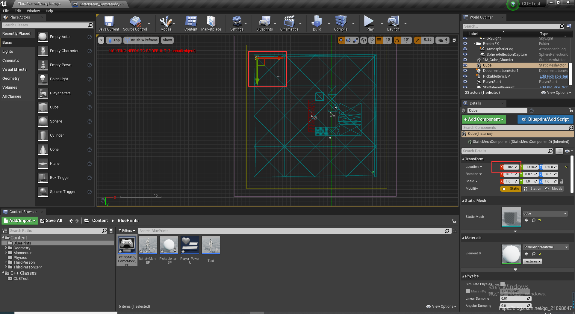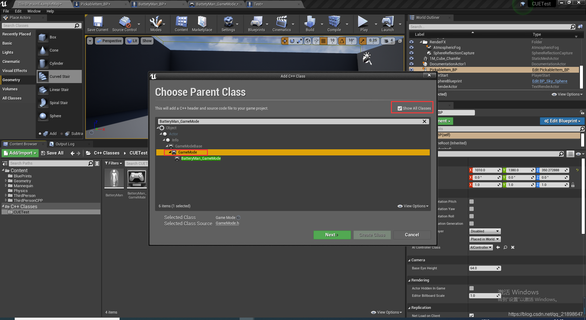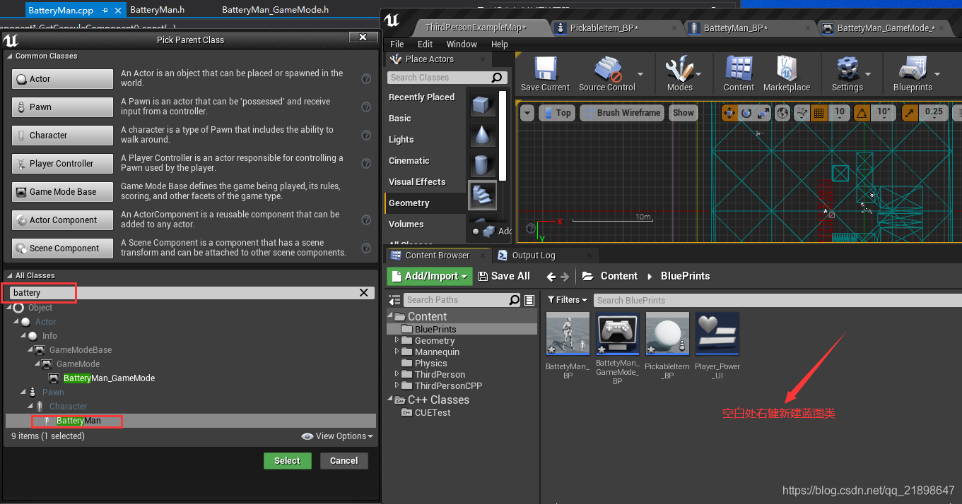 在UE中新建文件夹BluePrints,并在BluePrints中右键新建BatteryMan的蓝图类