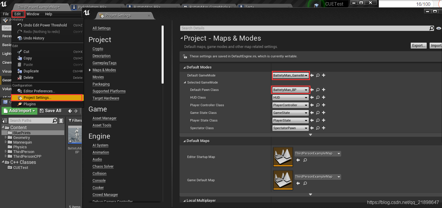 接下来进行如下设置,设置游戏开始控制的角色蓝图类以及游戏操作模式的蓝图类:
