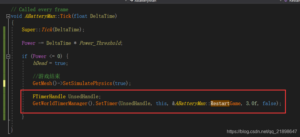 GetWorldTimerManager().SetTimer(UnsedHandle, this, &ABatteryMan::RestartGame, 3.0f, false);