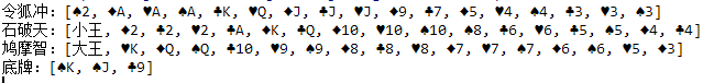 4. 查看三人各自手中的牌(按照牌的大小排序)、底牌