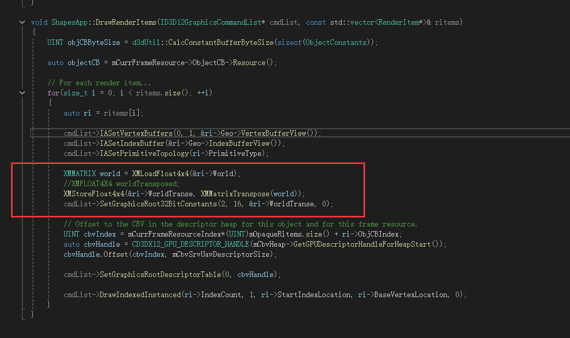 然后在DrawRenderItems()函数内部给commandlist添加命令: