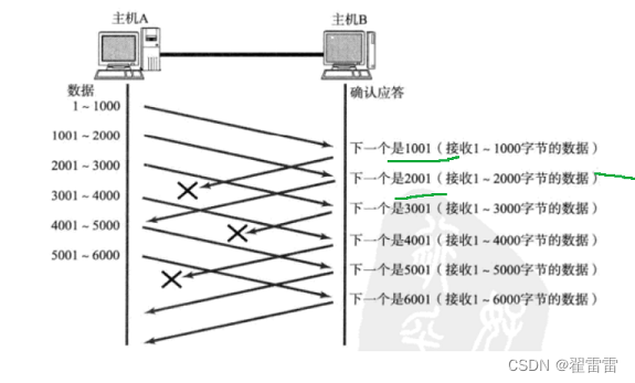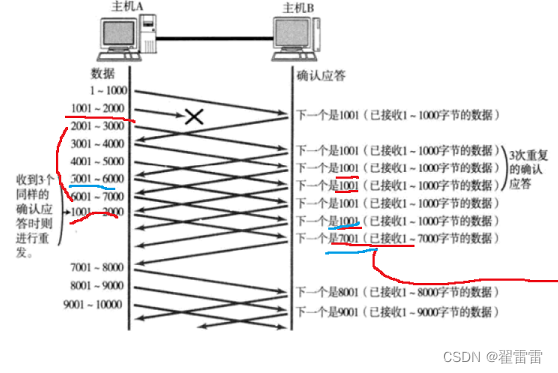 如果中间的数据丢包了,比如1001-2000丢了,那么这组返回的ACK就会一直是1001前面的序号,等于说服务器向客户端一直索要1001-2000的数据,那么客户端也会意识到问题进行重传,待服务器接受到丢失的数据,缓冲区进行序号重排,才会索要下一组数据;(快速重传,只传送丢包的数据)