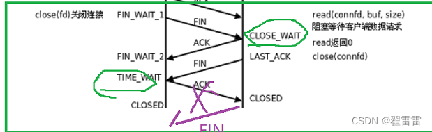 因为在握手和挥手的过程中,同样是会存在超时重传的,如果最后一个ACK丢包了,站在服务器的角度看,此时无法预知,以为是自己的FIN丢包了,就会重新发送FIN,这样就需要客户端重新回应,倘若此时没有wait而是直接close,这样就无法回应,因此利用TIME_WAIT状态保留一段时间,防止ACK丢包情况;
