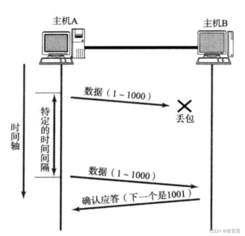 A给B发送数据,在发送的过程中丢包了(网络拥堵,B处断网等),或是到达B处了,但是B在返回ACK的过程丢包了(即A无法确认B是否收到数据),在一段时间后,A就会重新发送数据。