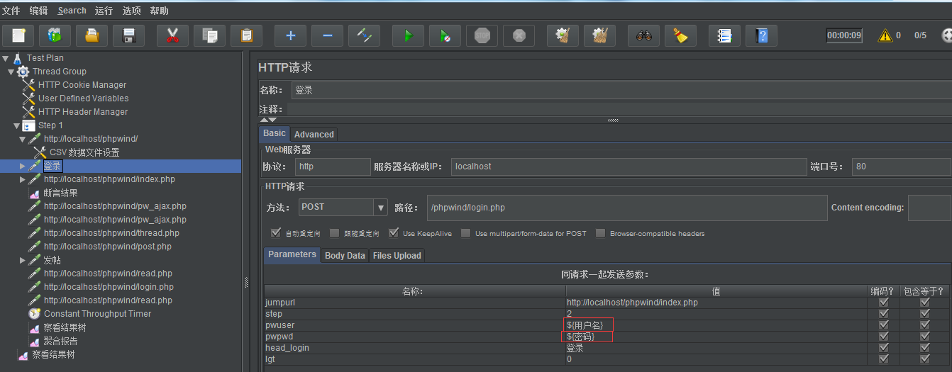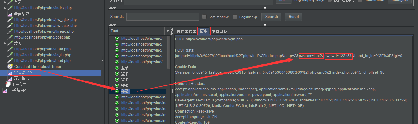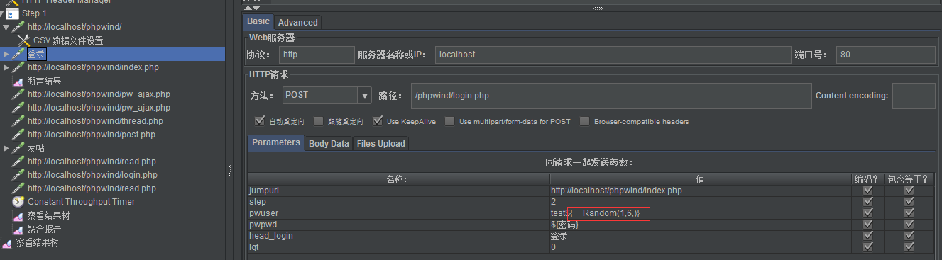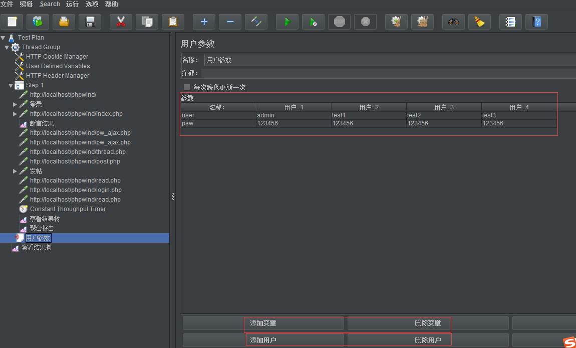 引用已配置的参数,然后运行脚本(多设置几个线程验证不同的参数),查看结果树,检查用户名,密码是否都是参数配置的