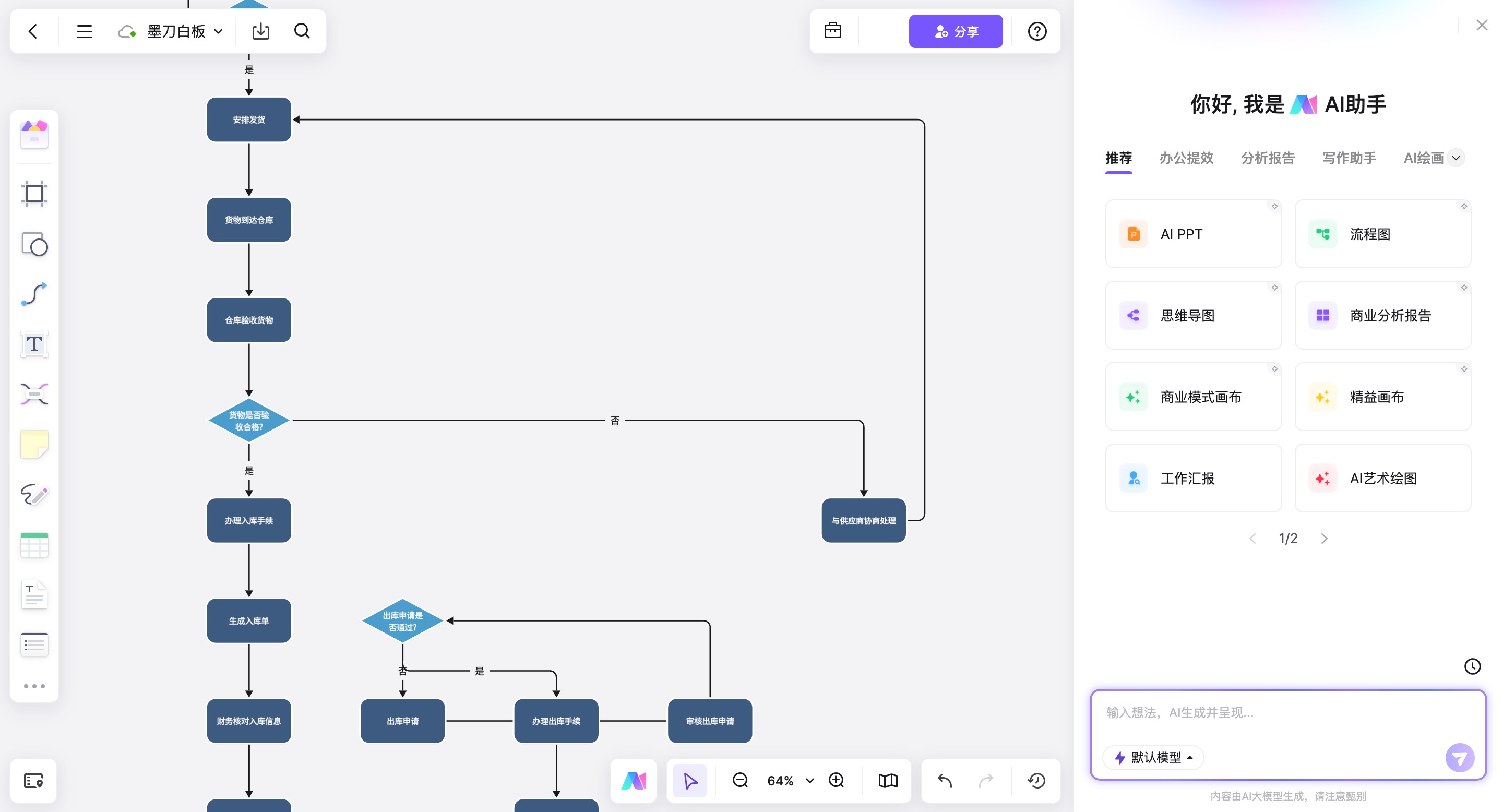 - 产品经理输入:“ERP系统的采购管理与入库出库财务结款流程”,AI便可自动生成完整业务流程图;