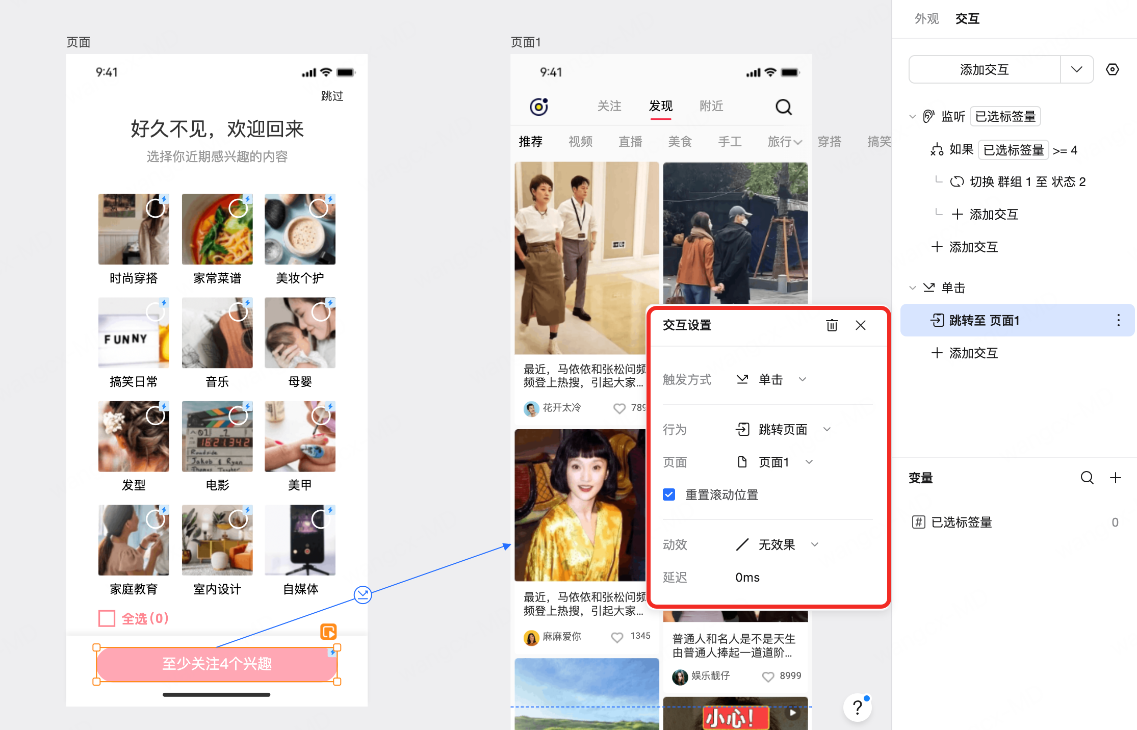 3、其余兴趣标签按照相同逻辑设置变量绑定与状态切换,确保用户每次点击选择时,底部“已选兴趣数量”能够实时更新。