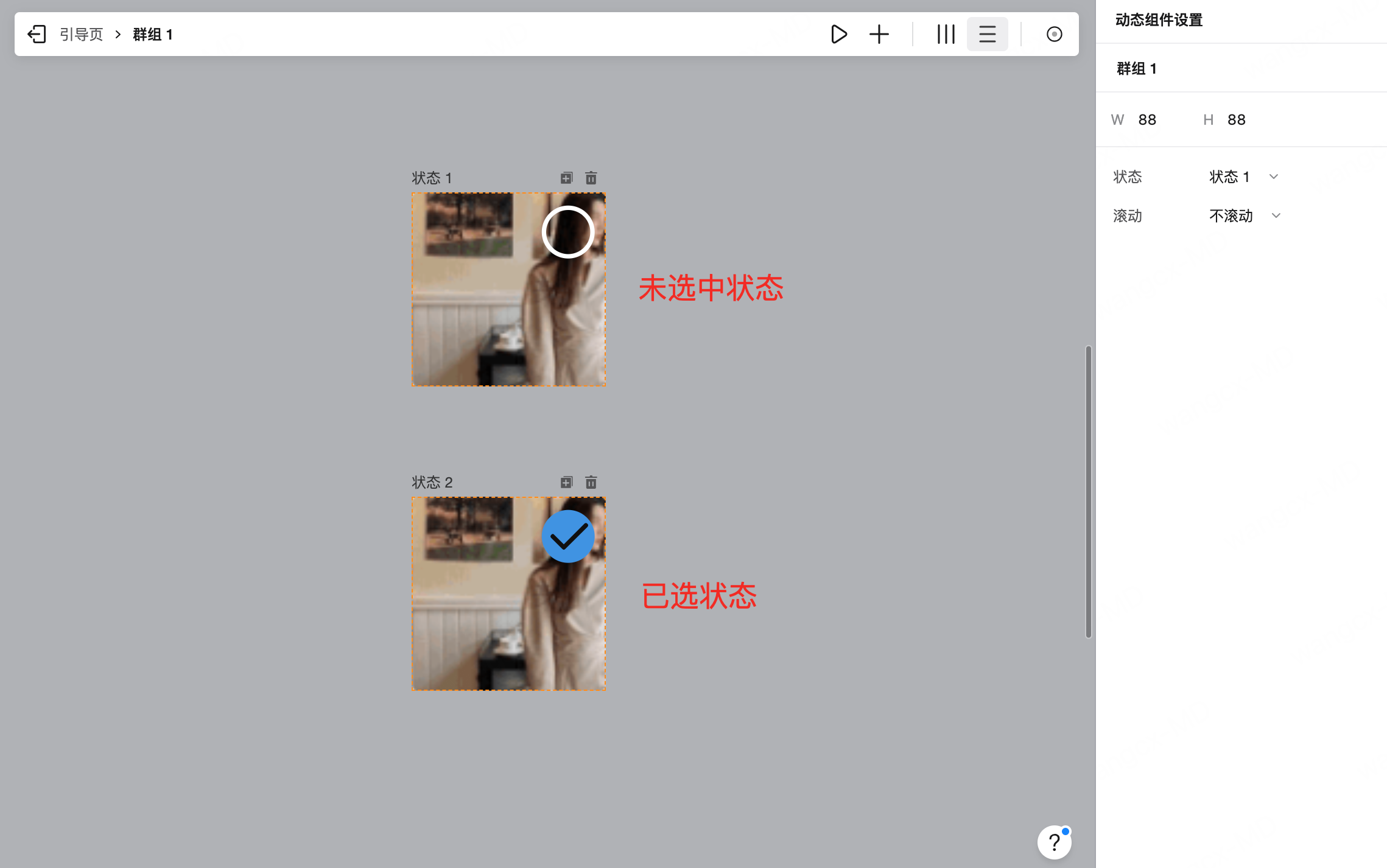 2、进入该组件的动态面板,复制默认图标,分别设置为“状态1”(未选中)和“状态2”(已选中)两种状态