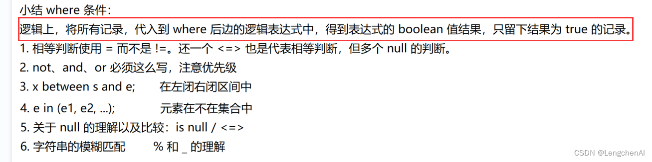 b. 关于null和其他值的比较,不能简单的使用 = 或者! =。单使用这两种只会得到null。需要使用is null或者is not null。或者是使用<=>逻辑相等