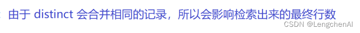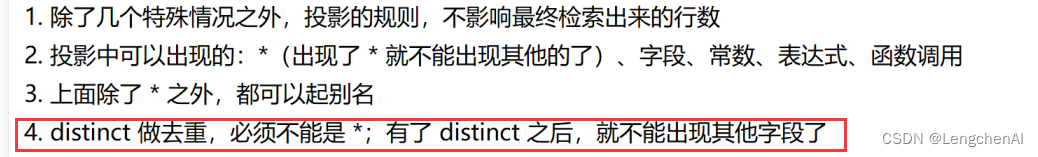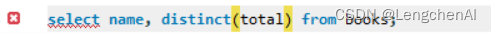 c. 注意:有了distinct + 字段,就不能有其他的字段了。因为如果出现其他字段,那么根据不同的字段投影出的行数都不一样,那么就会造成冲突,例如下列报错例子。