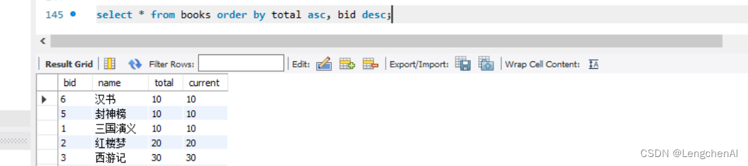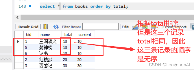 以上面的例子来说,这三个根据total来排序,则这三个记录的相对顺序是无序的,那么可以根据bid再次排序,则这三个记录的相对顺序就确定了,例如下面的例子。
