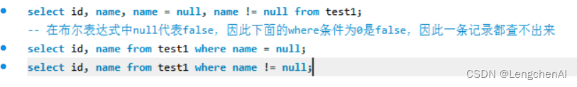 b. = :判断是否相等,不能进行NULL和NULL之间的比较。