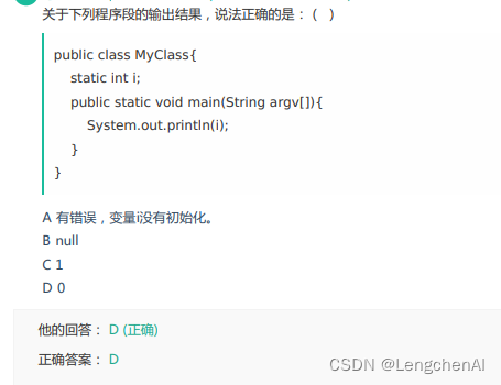 解析:静态方法中调用静态变量是可以的。没有赋予其初始值,int的默认值是0。因此答案为0
