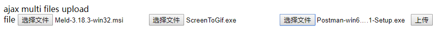 1 <span>ajax multi files upload</span> 2 <div class="container"> 3 <label>file</label> 4 <input type="file" name="file" id="files1"> 5 <input type="file" name="file" id="files2"> 6 <input type="file" name="file" id="files3"> 7 <input type='button' value='上传' id="btn_uploads" /> 8 </div>