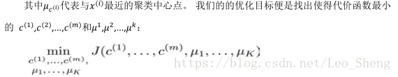 } 算法分为两个步骤,第一个 for 循环是赋值步骤,即:对于每一个样例xi,计算其应该属于的类。第二个 for 循环是聚类中心的移动,即:对于每一个类K,重新计算该类的质心。1.2 优化目标(代价函数或畸变函数)